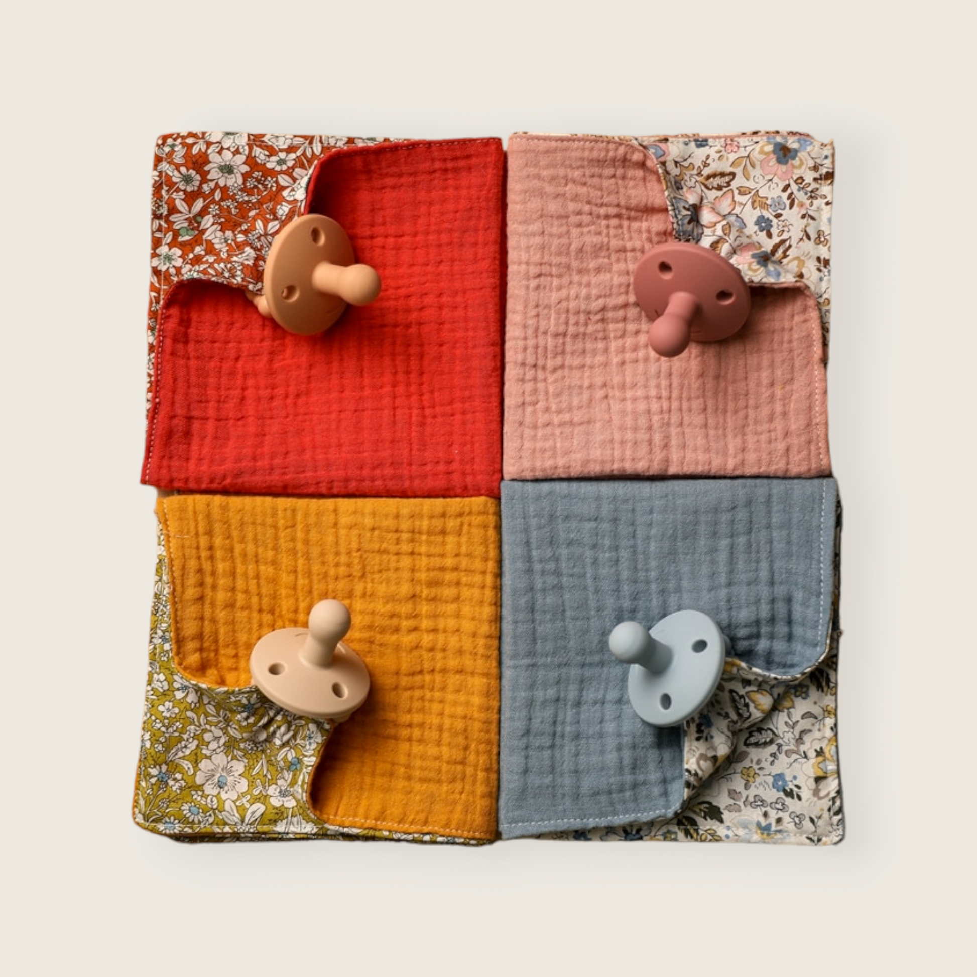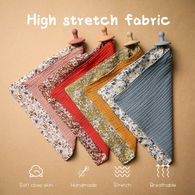 Organic, muslin comforter blanket accompanied by a pacifier, perfect for teething babies.
