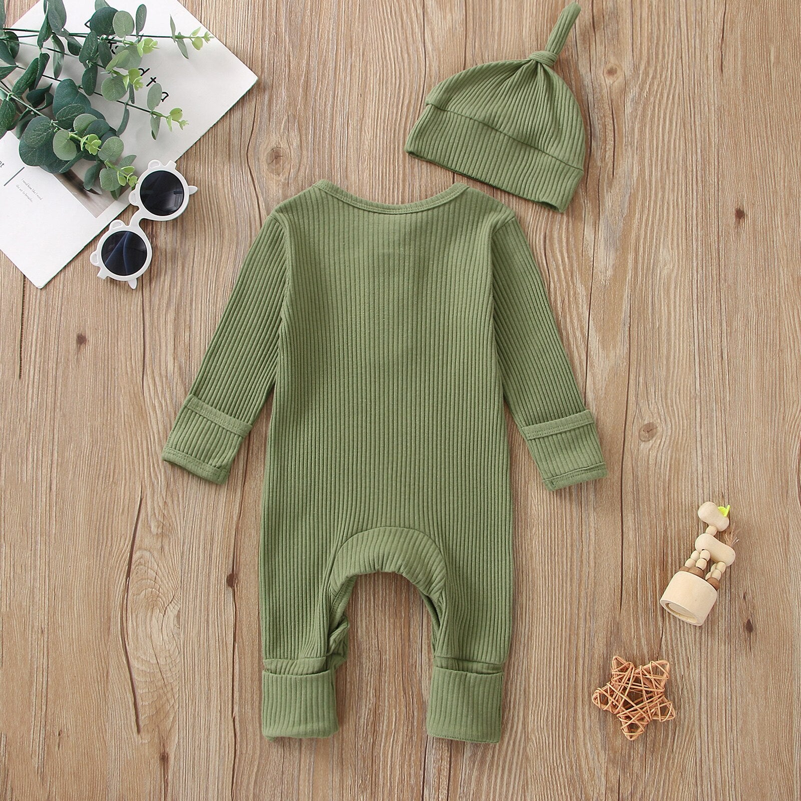 Cute little knitted jumpsuit and hat set made from a super cozy and comfortable cotton blend.