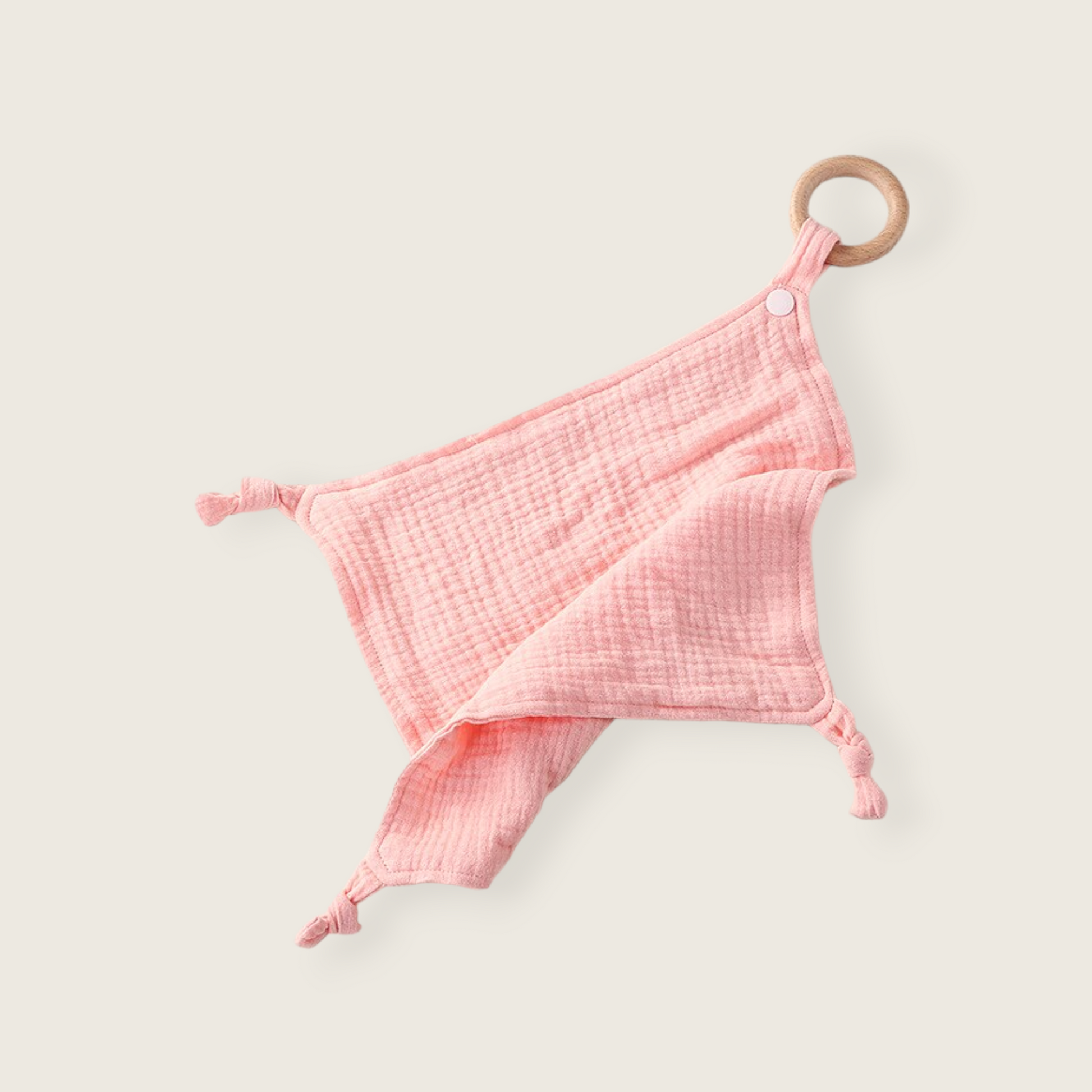 This organic muslin comforter blanket is the perfect companion for your little one, combining softness and security with a 2.5" beechwood ring designed for teething babies. The adorable design ensures it will quickly become your baby’s favorite comfort item.