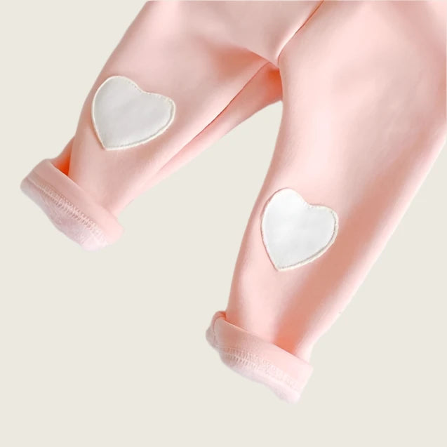 Keep your little one warm and stylish this winter with our Love Patch Baby Pants! These soft, cozy cotton pants are lined with plush velvet for extra warmth and comfort, perfect for those chilly days. The adorable love-shaped patches on the knees add a sweet touch, while the stretchy waistband ensures a snug fit without restricting movement. Whether for playtime or lounging, these versatile pants are sure to become a wardrobe favorite for your baby girl.